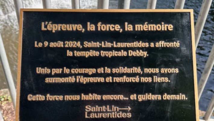 Le 9 août 2024, Saint-Lin–Laurentides a affronté la tempête tropicale Debby. Unis par le courage et la solidarité, nous avons surmonté l’épreuve et renforcé nos liens. Aujourd’hui, un an plus tard, nous nous souvenons. Nous rendons hommage à toutes celles et ceux qui ont tendu la main, travaillé sans relâche et protégé notre communauté. Cette force nous habite encore… et nous guidera demain.